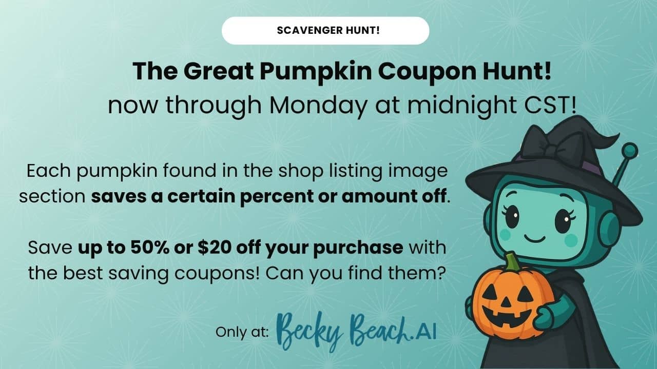 How's it going, Reader? The Great Pumpkin Coupon Hunt - Now through Monday! In the BeckyBeach.AI shop, there are pumpkins with coupon codes hidden in the shop listing image area. Your customer can save up to 50% off or $20 off their purchase. Each coupon takes off a different amount. Can they find the top saving coupons? Sign up to my affiliate program here! https://beckybeach.ai/affiliates When you join, you will get an email with your link. Directions: You will get your link via email after...